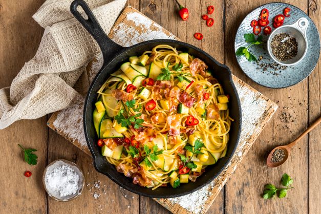 Skær baconen i stykker, vask squash og skær halvdelen af dem på la...