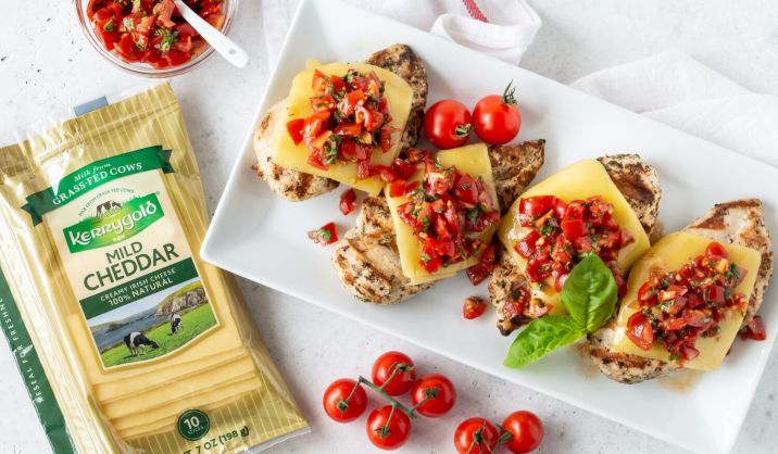 • Ζεσταίνετε λάδι σε τηγάνι και τηγανίζετε τα σνίτσελ στο καυτό λάδι μέχρι να κάνουν μια τραγανή ρόδινη κρούστα από τη μια πλευρά. Τα γυρίζετε και τοποθετείτε στην τηγανισμένη πλευρά από μία φέτα Kerrygold Imokilly Regato Classic.