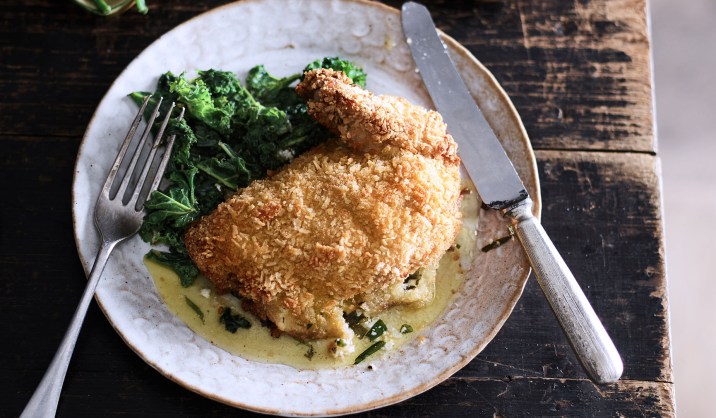 - Dust the filled breasts all over with flour, dip into the beaten egg and then roll in the breadcrumbs. Cover and chill for 20 minutes.